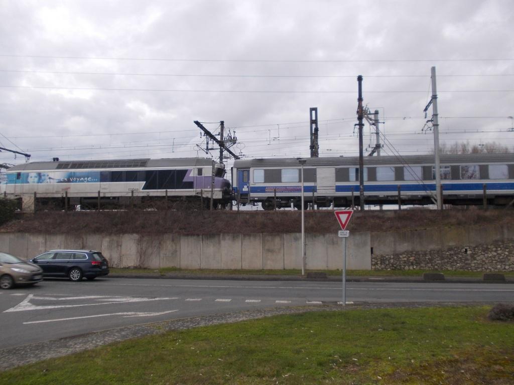 Draisine vu lundi à Sant-Pierre-des-Corps, tractée par la belle CC 72049 et derrière une Corail de l'AEF et en queue 3 fourgons.