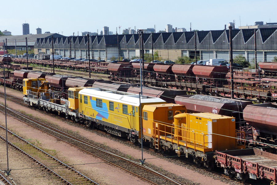 Voici une voiture de contrôle ultrason des rails toute neuve. elle est construite par Matisa (modèle M1200US). Ce serait la voiture V15 selon le marquage. Elle est exploitée en joint-venture entre la SNCF et Eurailscout suite au rapprochement des deux sociétés. Vue à angoulême le 15 juin 2016.