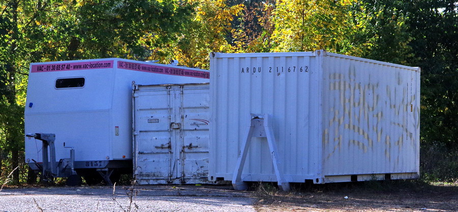 conteneurs et une caravane de vie de la société VAC location d'Eiffage en gare de La Fère le 16-10-2018