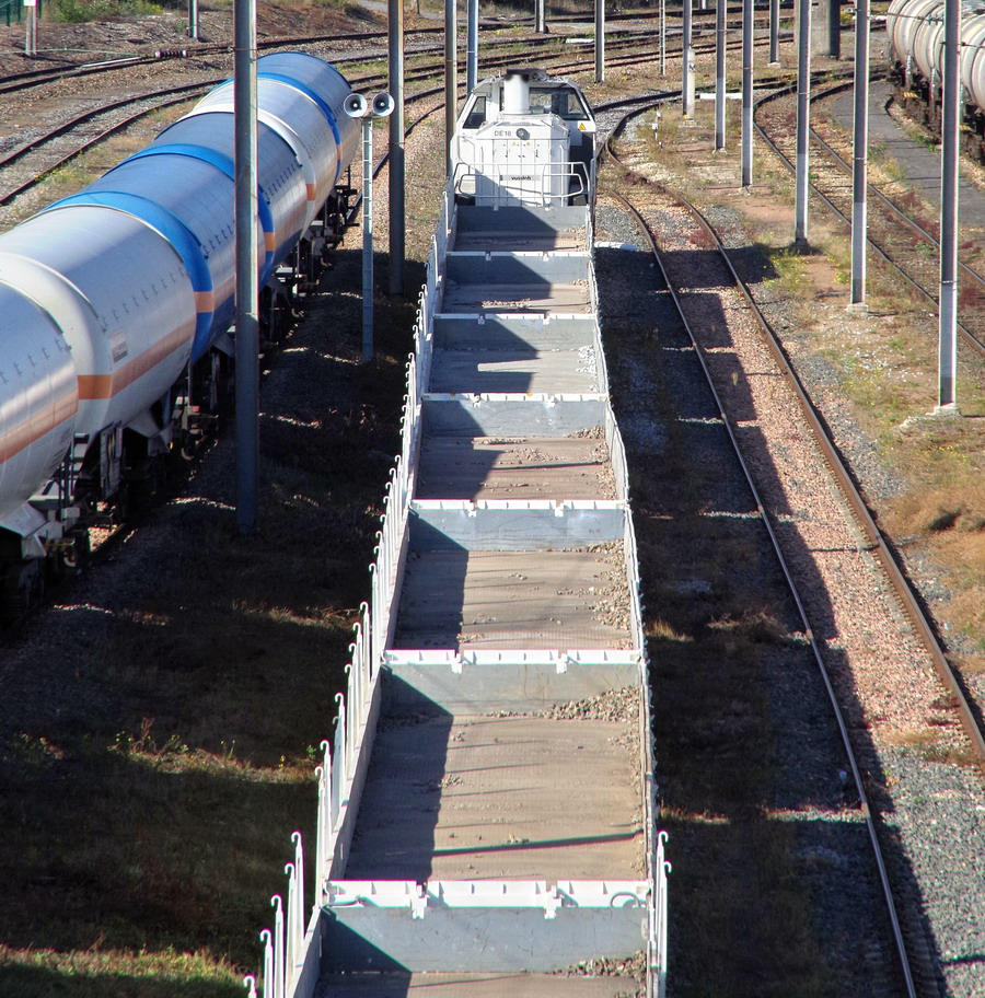 avec utilisation d'une machine Vossloh DE 18 5502348 EVN n°92 87 4185 016-0 F-ERS - Eiffage ERS MF418 sur une rame de wagons plats