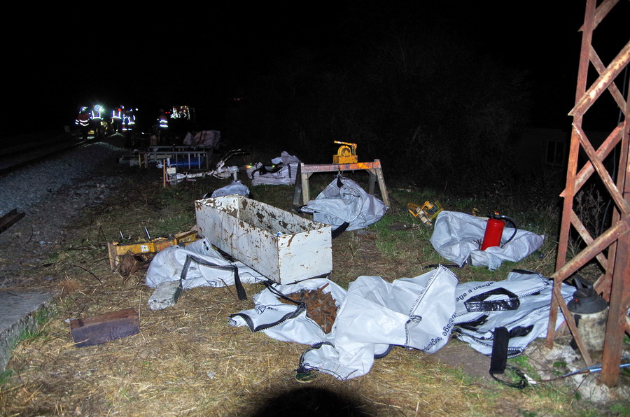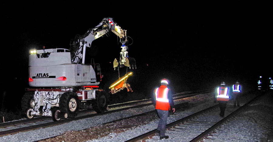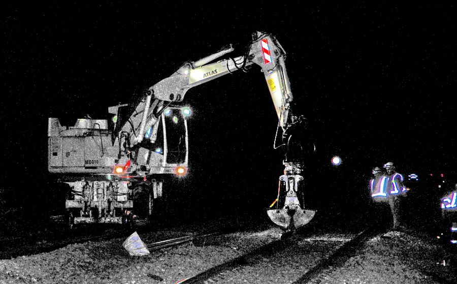 avec la présence de deux Pelles Rail route d'Eiffage et des conteneurs et une caravane de vie de la société VAC location