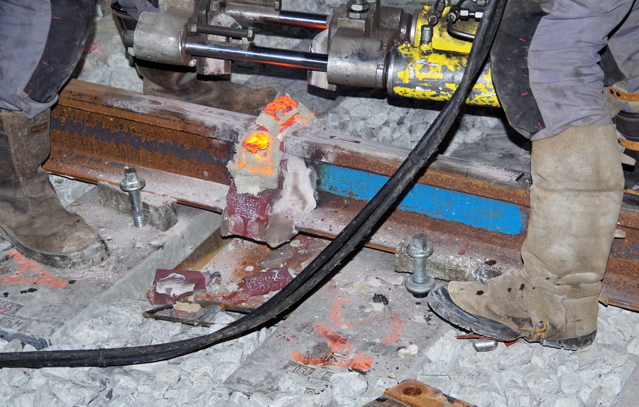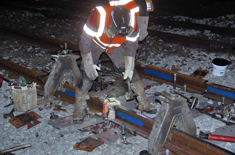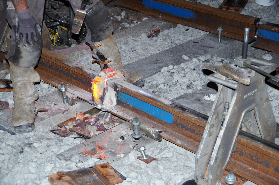 puis décalaminage après la soudure Aluminothermique et le meulage des rails neufs avant la mise en circuit (La calamine est un