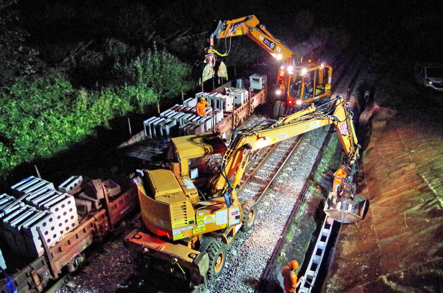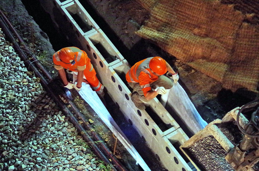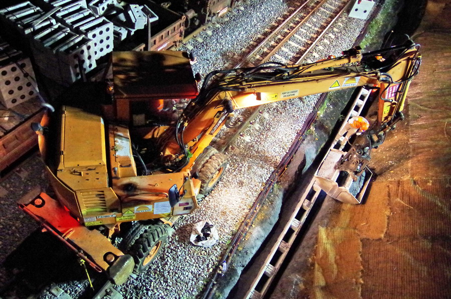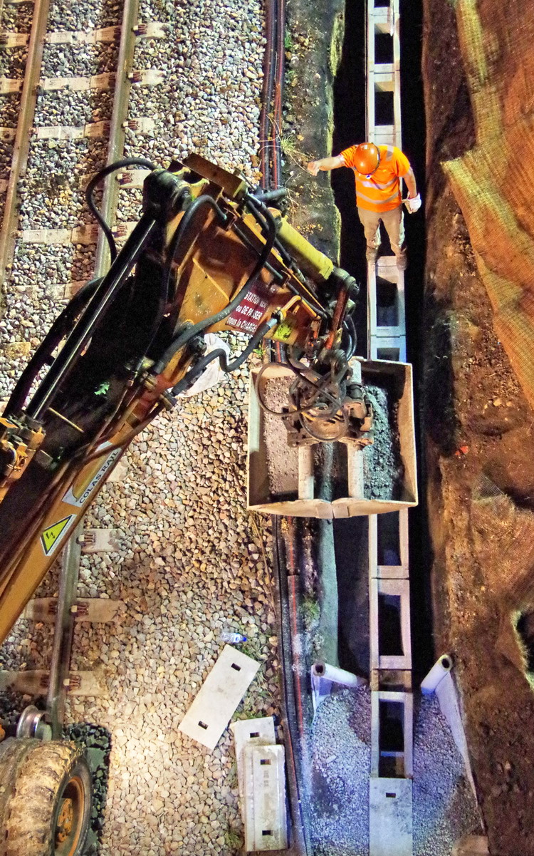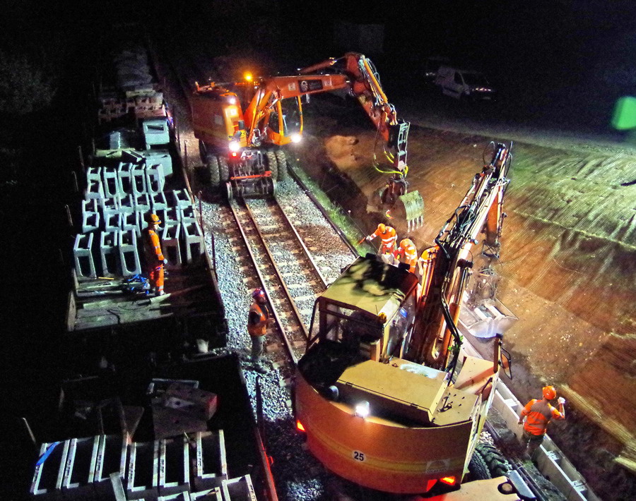 avec la présence des deux Pelles Rail route Colas Rail pour les travaux de caniveau
