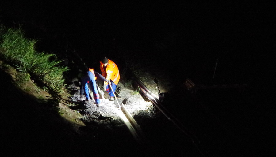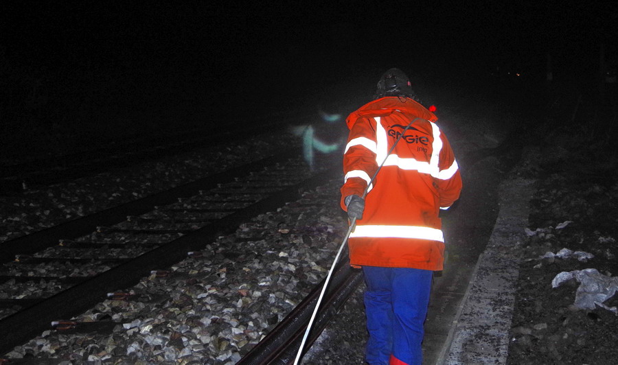 pour l'installation des caniveaux grand modèle pour le passage de câbles de mise à la terre avec enfouissement par une équipe d'Engie.