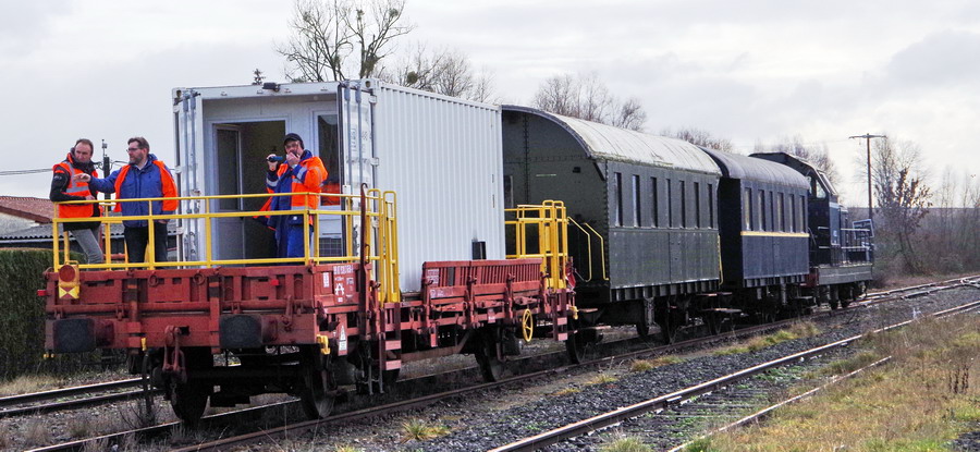 de l'équipe technique de Socorail Europorte du wagon de Télémétrie et de la société Baulot TP spécialiste du Transport ferroviaire pour