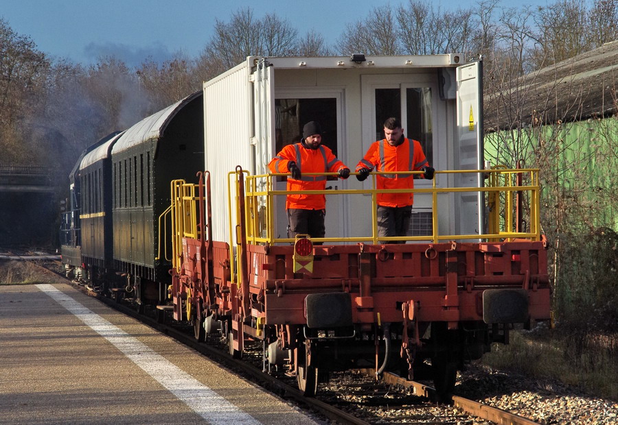 départ du train du CFTV avec le wagon de Télémétrie en gare d'Origny-Sainte-Benoîte le 09 janvier 2019