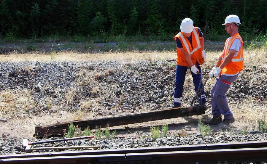 utilisation d'une Tenaille à traverses bois et d'une Masse pour retirer la vieille traverse en gare de Marle-sur-Serre PK 164,043 le 16-07-2018