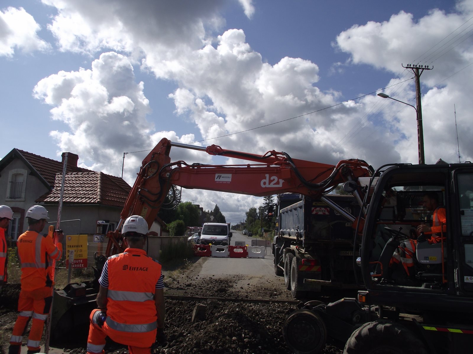 les travaux vont bon train!! Eiffage énergie system termine la pose des caniveaux dans la zone marais, Meccoli travaille sur les P.N.: dépose de l'ancien et pose du nouveau tronçon de voie et du platelage.