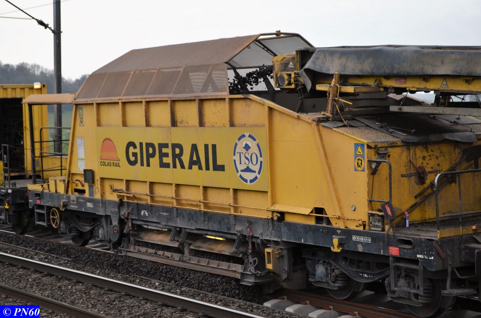 Photos du wagon situé juste avant le Gipérail chargé de faire le tri entre les traverses neuves et celles usagées. Le portique situé sur le wagon coulisse pour amener les traverses au niveau du chariot portant le numéro 4 situé en amont.