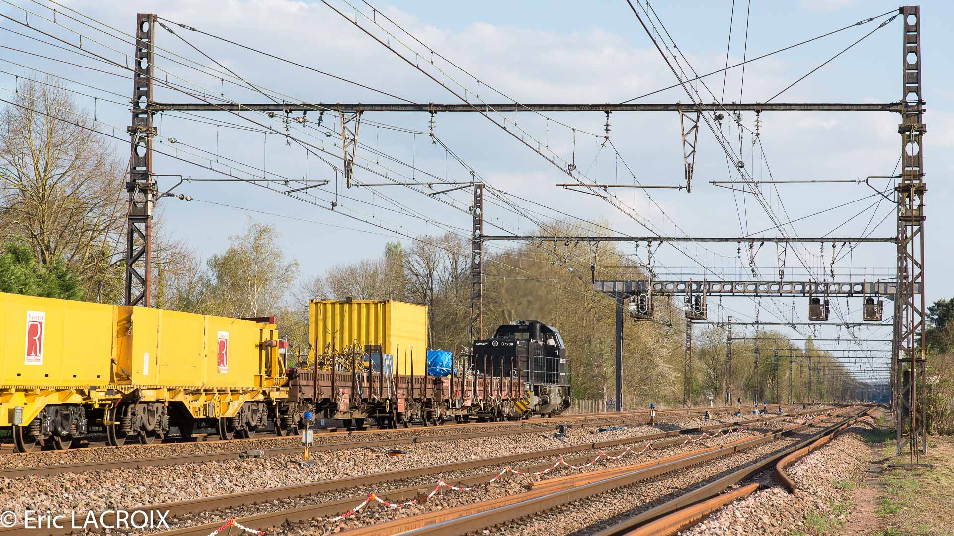 G1206 BB 5001730 - 92 80 1276 036-1 louée à ETMF en tête du train de renouvellement P95 MATISA Transalp Renouvellement passe à Villeperrot (89) pour rejoindre la base de travaux de St Florentin. Avril 2017.