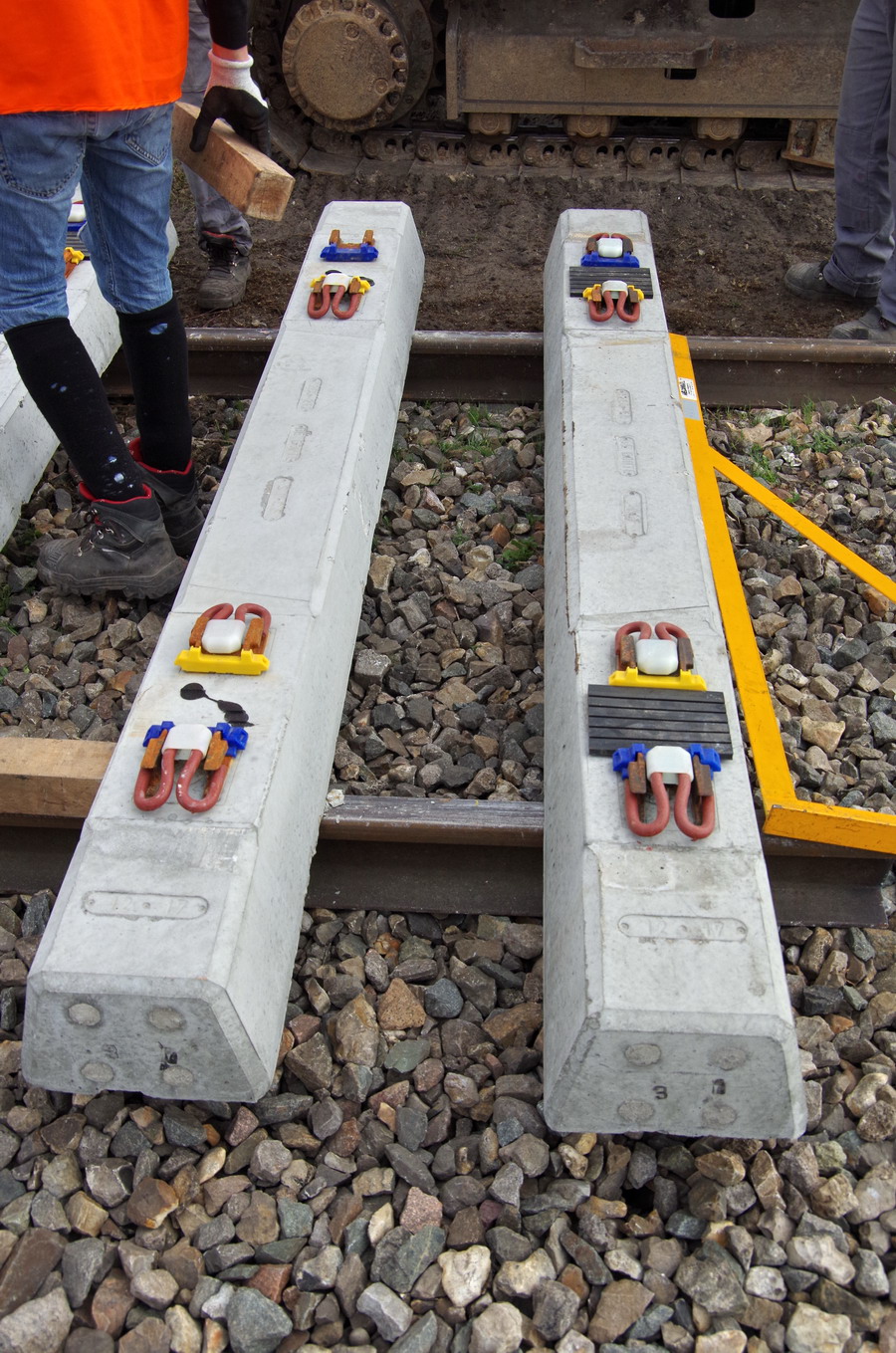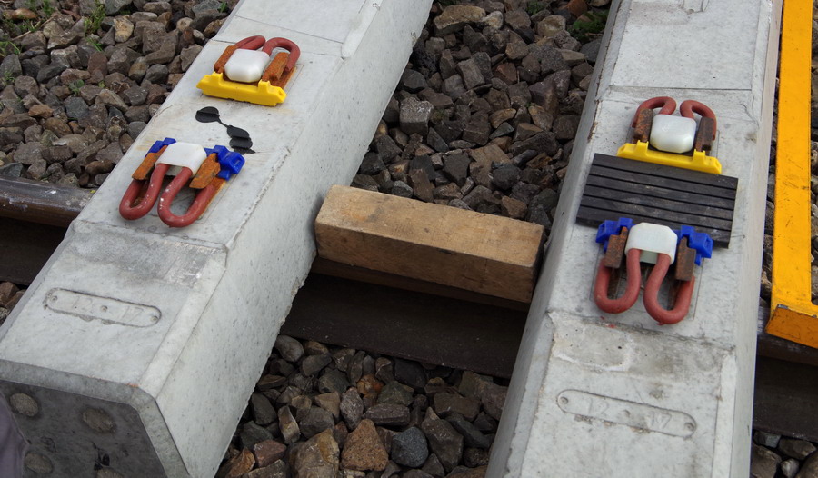 montage des traverses en béton monoblocs sur des rails de 50 kg avec des attaches Fastclip de Pandrol et montage des travers en bois sur des rail de 46 Kg