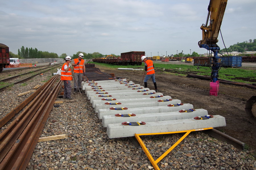 montage des traverses béton pour la fabrication d'un coupon mixte de 18 m par Meccoli sur la base de travaux à Laon le 24-04-2018