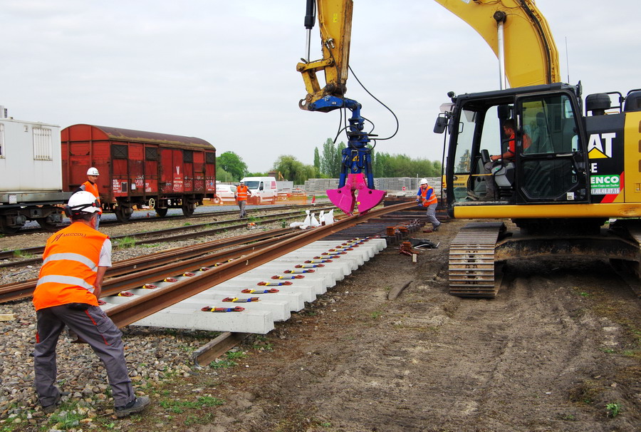 mise en place d'une traverse béton monobloc sur un rail de 50Kg a l'aide d'une équerre pour la fabrication d'un coupon mixte de 18 m par Meccoli sur la base de travaux à Laon le 24-04-2018
