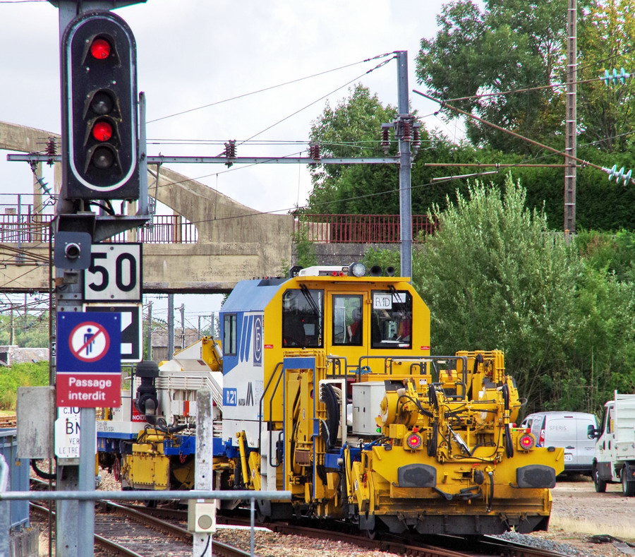 et maintenant sortie des engins de régalage et de bourrage de la base de travaux de la gare de Poix de Picardie pour