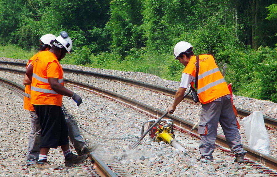Remplacement de traverses cassées puis bourrage en utilisant un vibreur Jackson