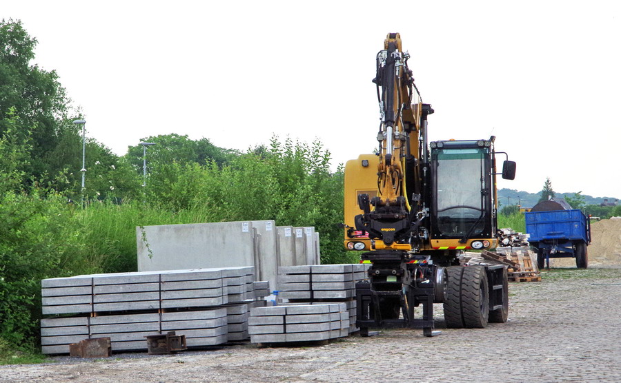 avec un ensemble de Pelles Rail route et d'une roulotte pour un chantier de pose des berlinoises, plaques en béton pour éviter les coulées