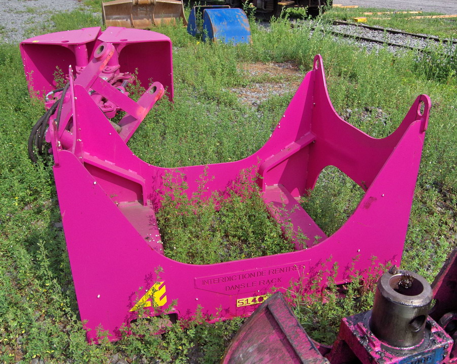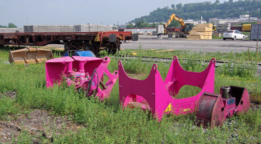 un ensemble de godets rose sur la base de travaux de la gare de Laon le 08-06-2018