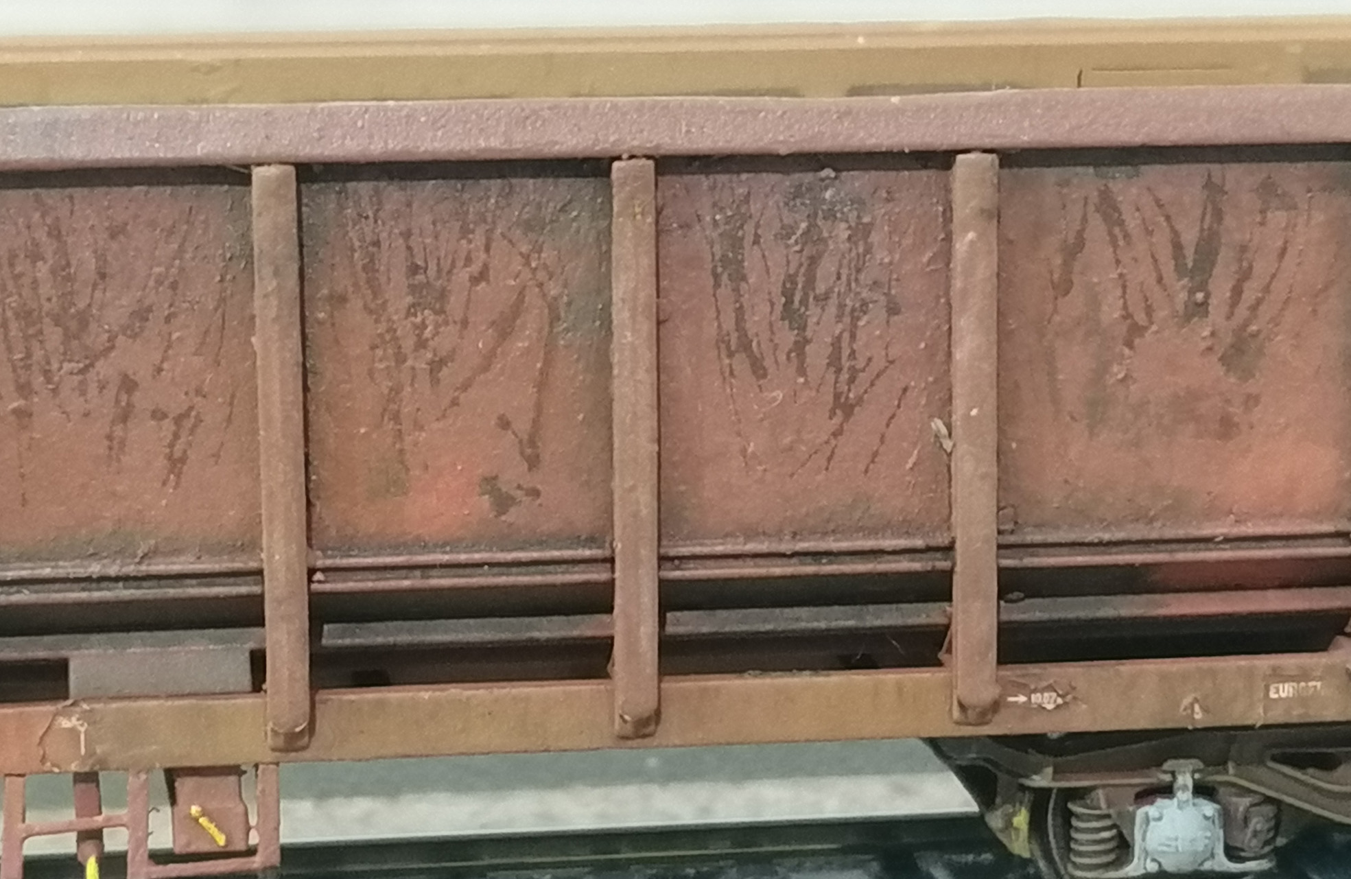 Après j'ai mis de la colle Z21 pour faire des bosses, de l'apprêt en bombe, du Burnt Amber de chez Vallejo, du pré-ombrage des recoins, ... Ensuite j'ai testé la technique du Hairspray (avec du sel) pour pouvoir faire apparaître la sous-couche une fois la teinte du wagon réalisée.