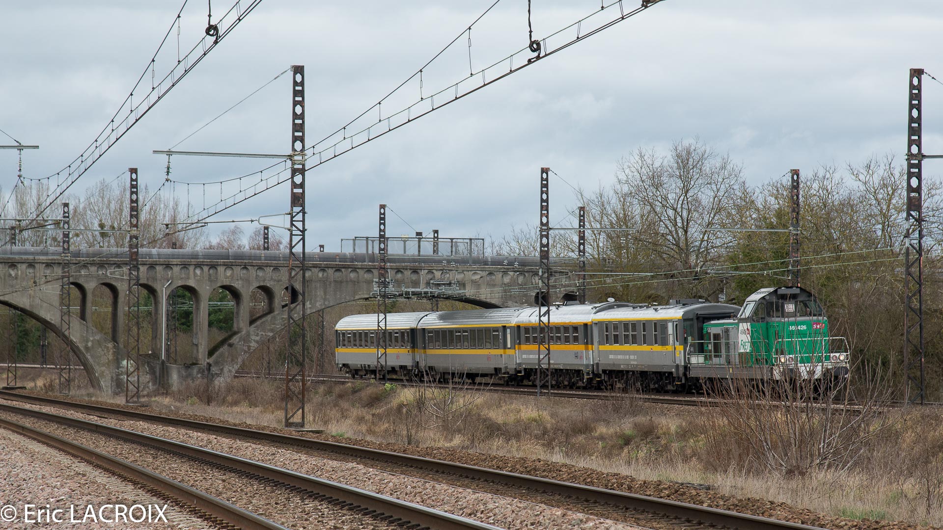 - BB 69426 en tête d'un INFRA (MAUZIN 216+ MAUZIN 211+ CORAIL INFRA 60 87 99-97 002-5+ CORAIL INFRA 60 87 99-97 001-7) arrive à Sens (89) en janvier 2018.