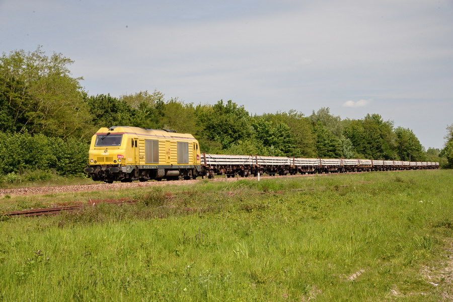 la machine repart le 04 juin 2019 pour Longueau en marche n°62032 avec une rame pleine de traverses conditionnées en provenance