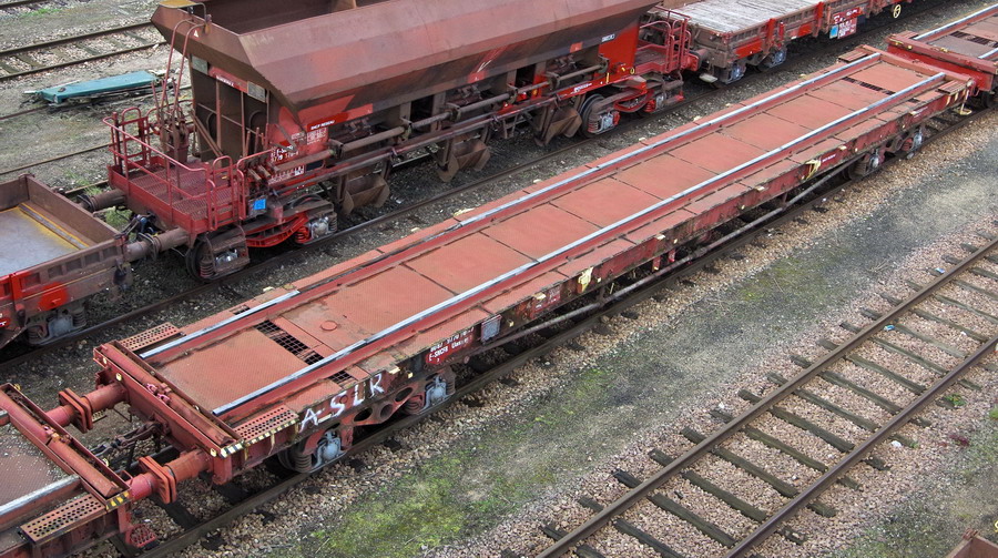 Voici le wagon 80 87 977 0 901-7 Uas R09 7 F SNCF-PSL Ã Saint Pierre des Corps le 16-09-2014 vide de chargement de traverses