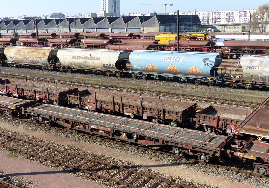 On retrouve le wagon 80 87 977 0 246-7 Uas R09 2 F SNCF-PSL avec un chargement de traverses