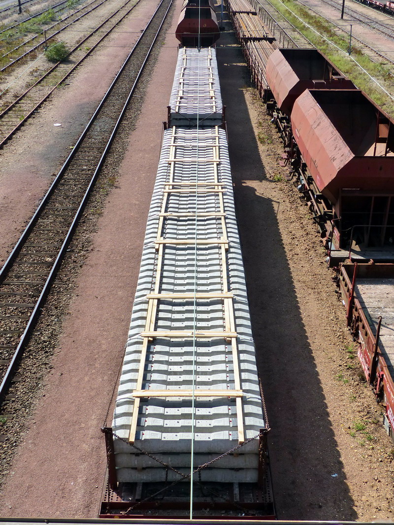 On retrouve le wagon 80 87 977 0 246-7 Uas R09 2 F SNCF-PSL avec un chargement de traverses