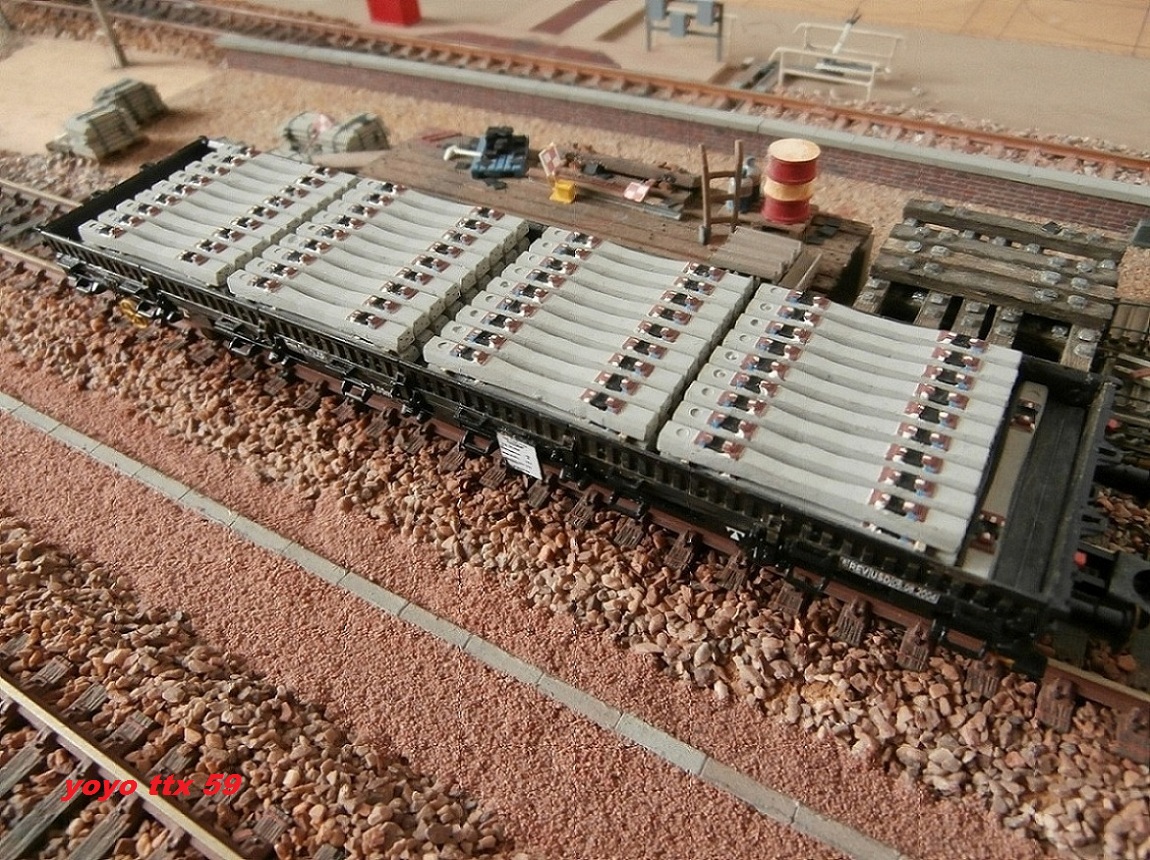 Voici l'une de mes réalisations purement imaginaire , sauf pour le chargement qui lui est bien réel(d'aprés photos).La base du wagon est d'origine Sai(Kibri).Les traverses proviennent de la voie traverses beton code 83 de chez Roco "ref:42401".