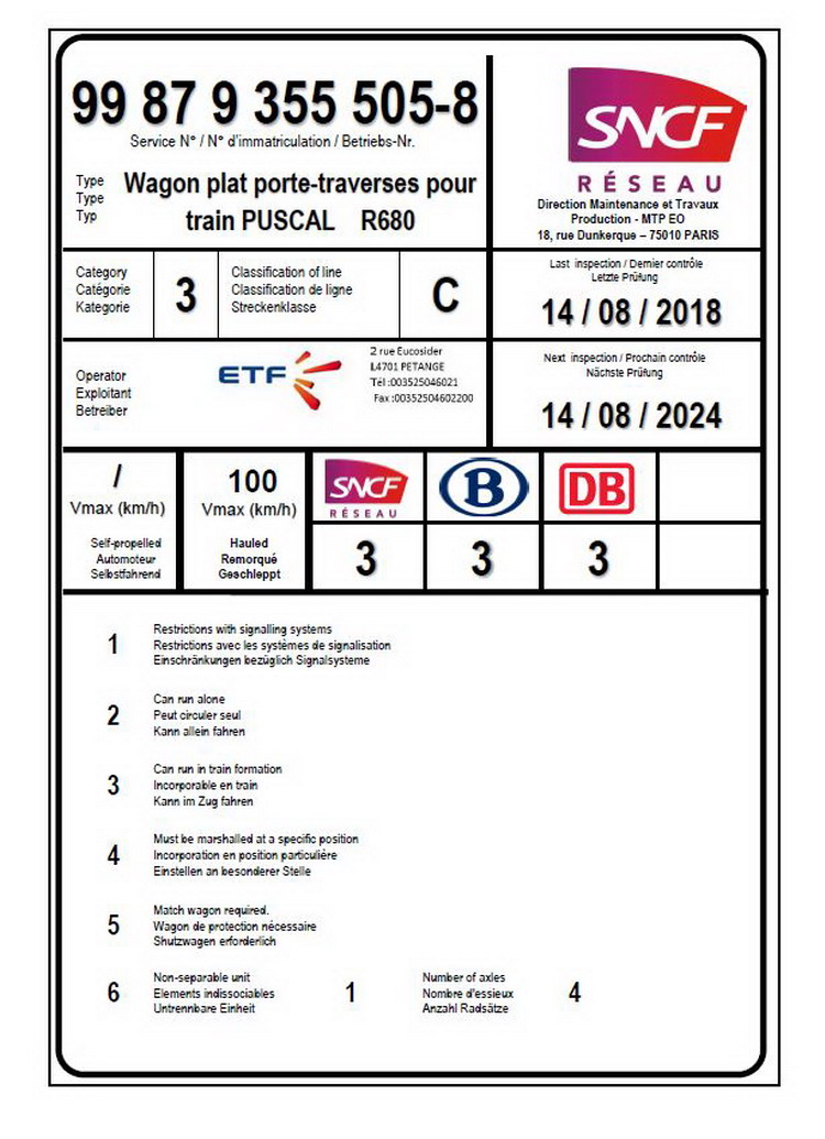 Voici l'Agrément du wagon plat S680 porte-traverses pourle train PSCAL