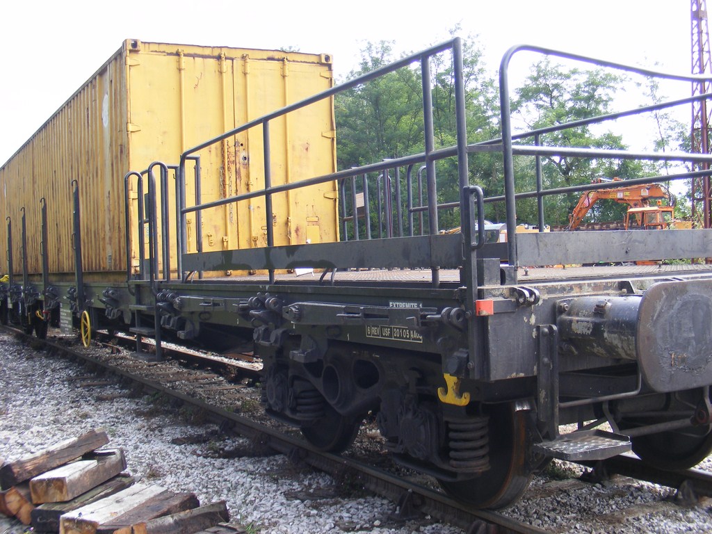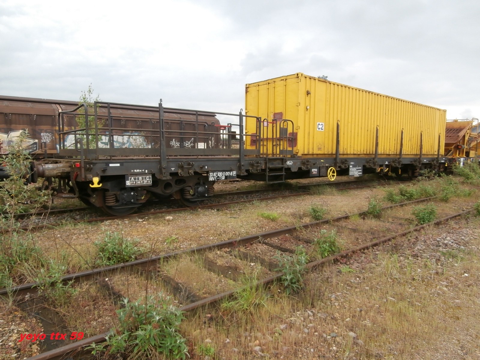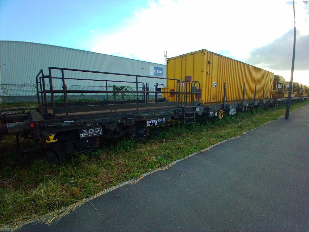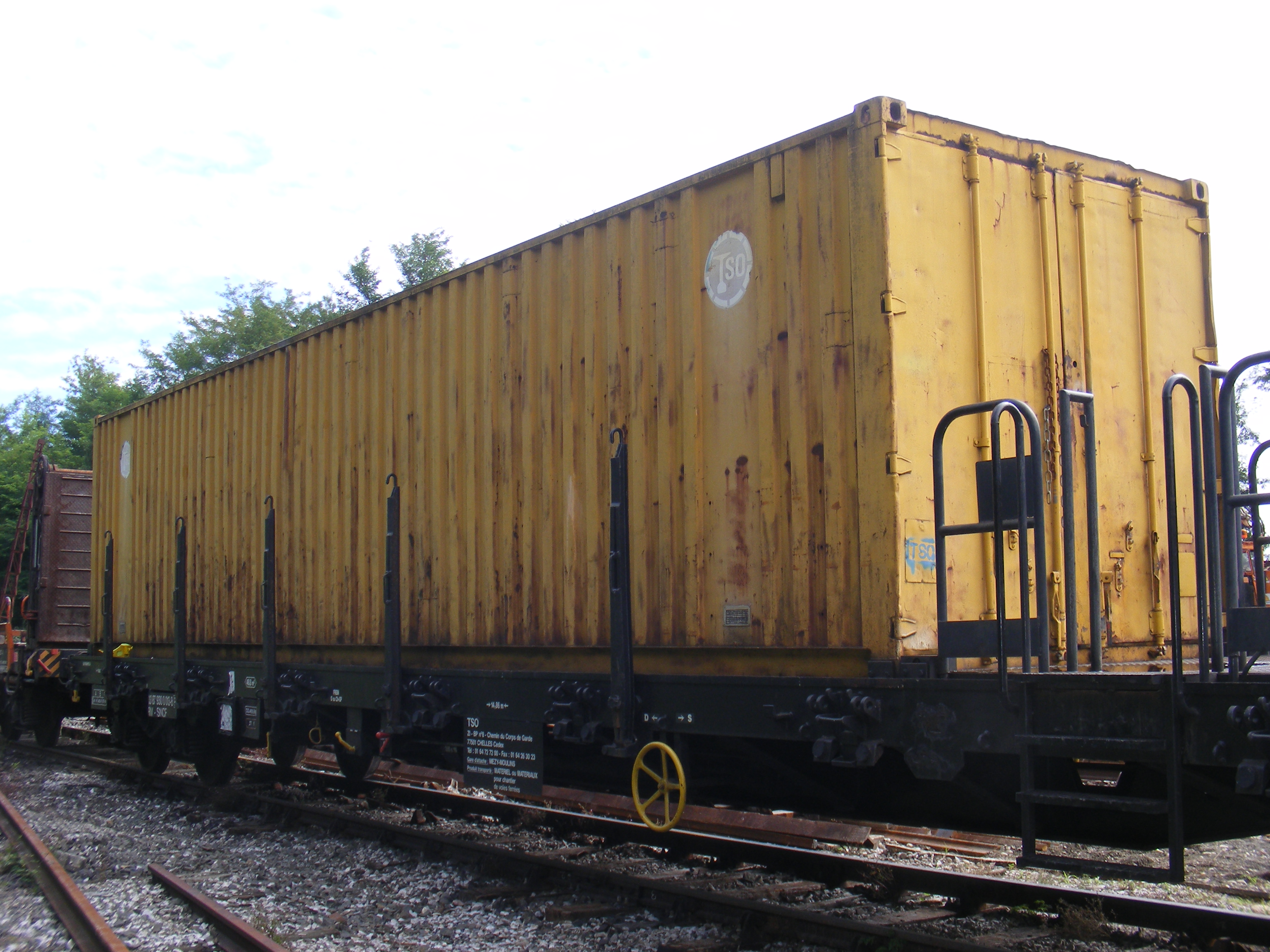 un plat immatriculé "wagon de particulier", pratique courante chez TSO. A noter l'ancien logo TSO sur le container.