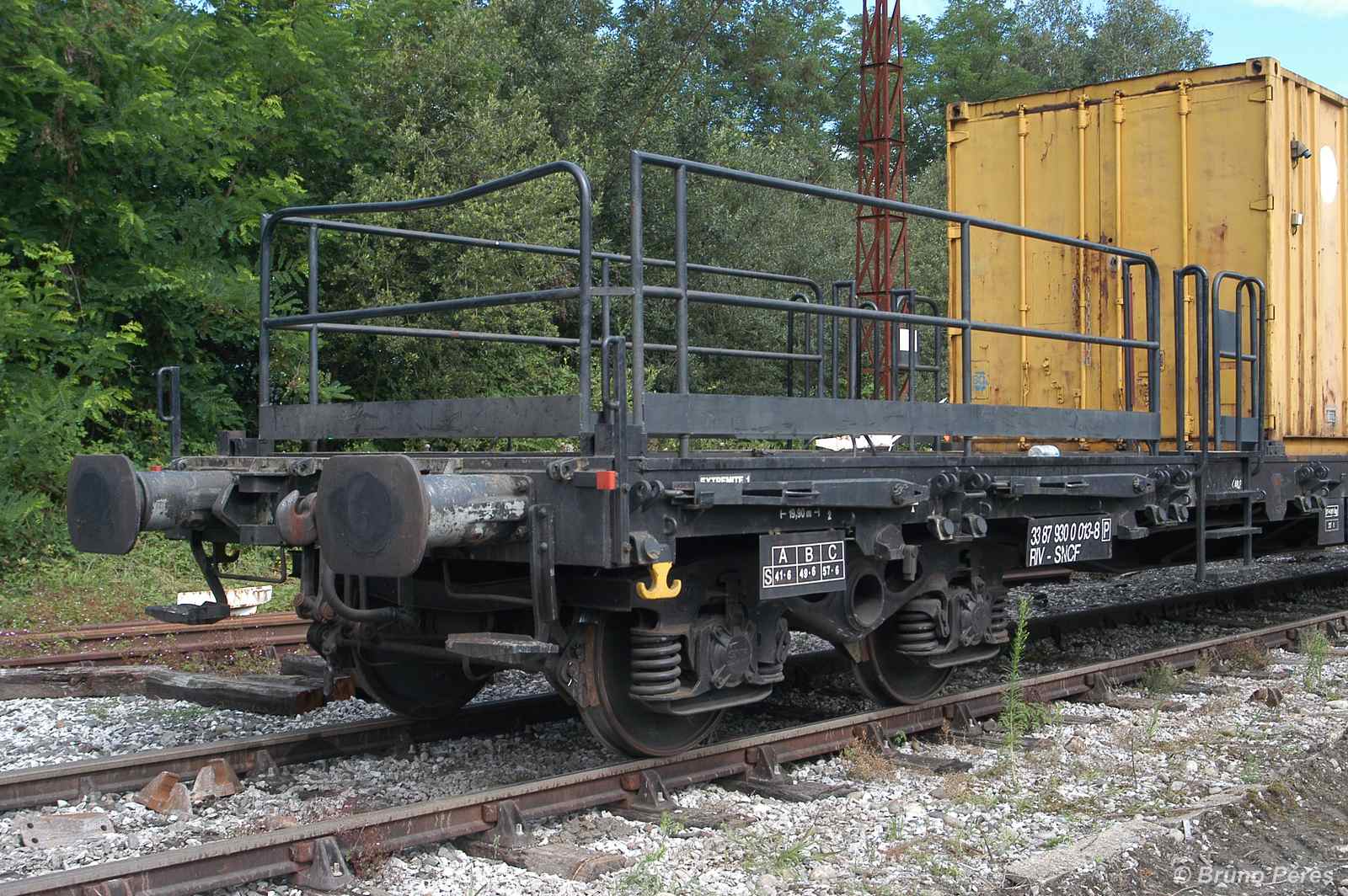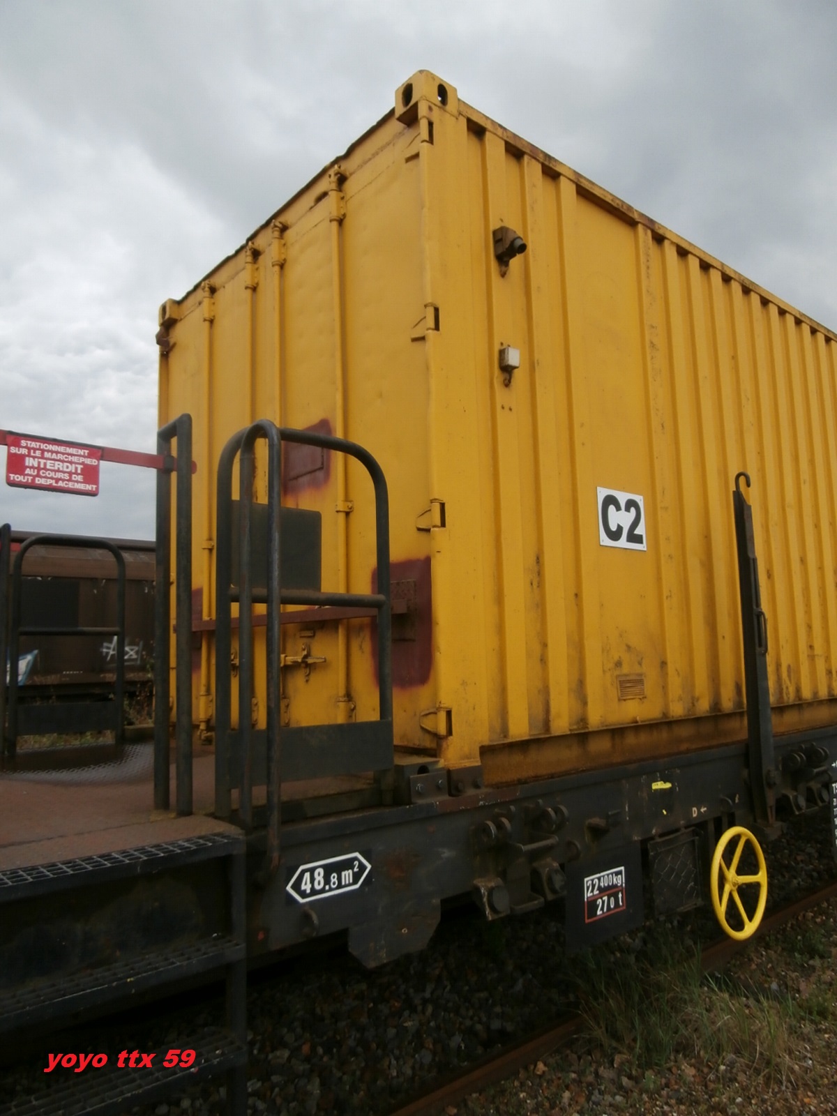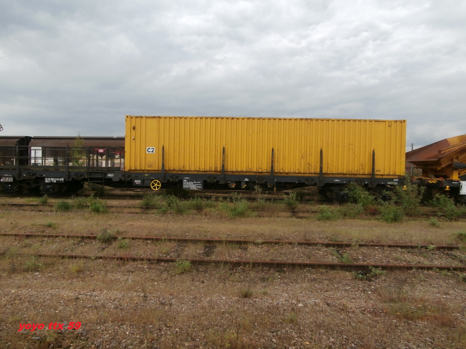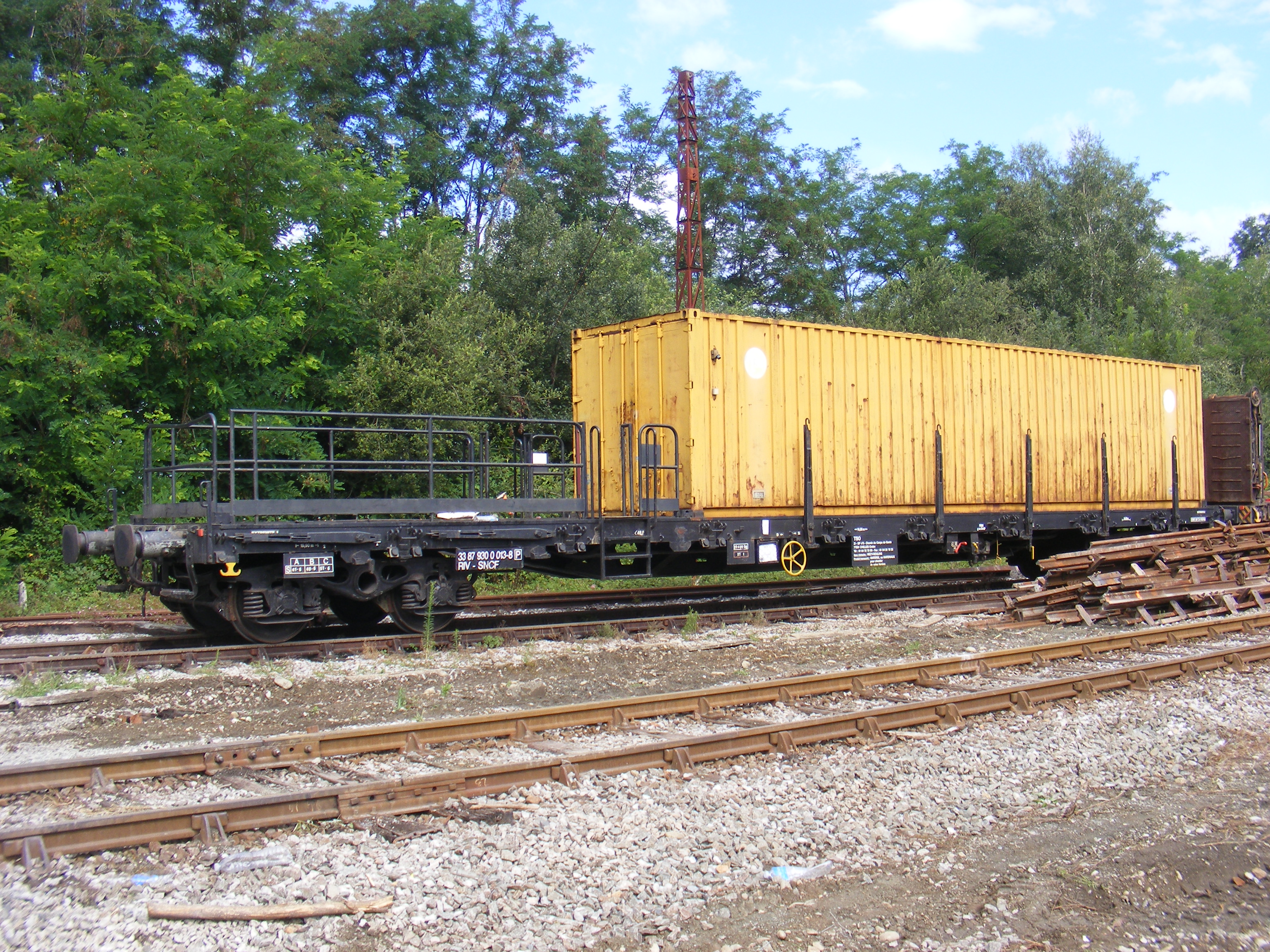 un plat immatriculé "wagon de particulier", pratique courante chez TSO. A noter l'ancien logo TSO sur le container.