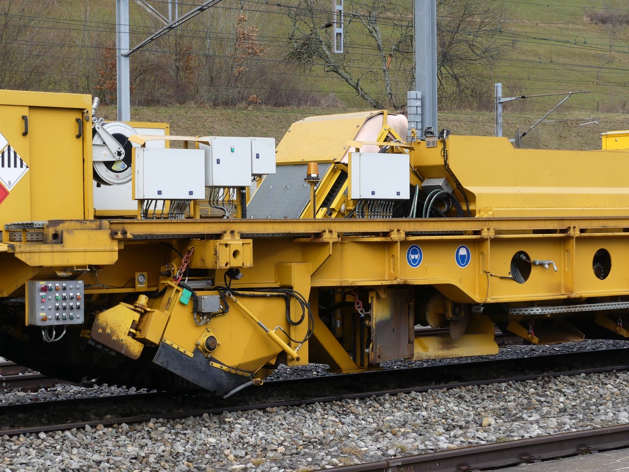 Voici un wagon que j'ai pris en photos à Vallorbe. Je penses qu'il accompagne le Puscal S. Il porte une brosse ainsi qu'un silo de stockage du ballast et des trappes pour le déversement.