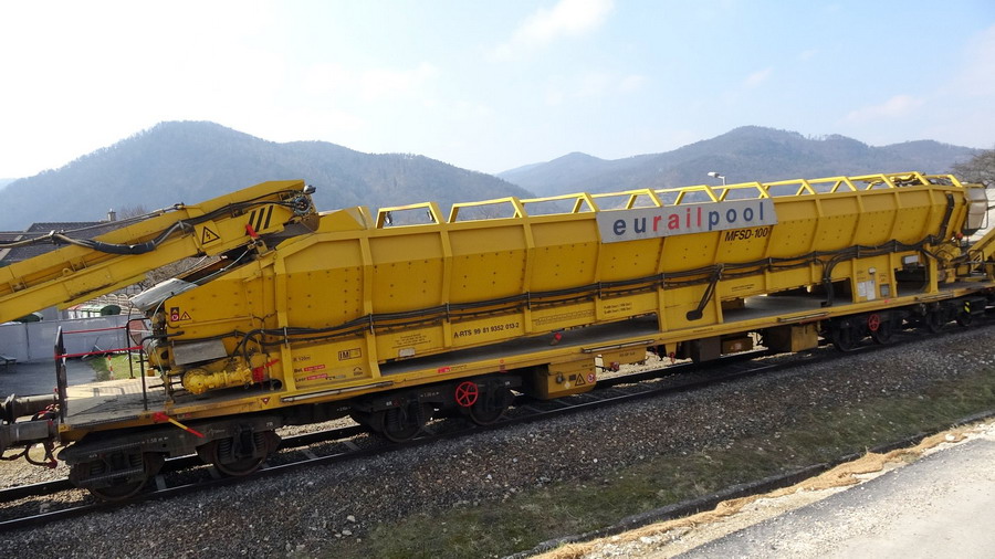 wagon MFS 100 Wagon auto-stockeur et déchargeur Eurailpool en gare de Dürnstein (A) le 25-03-2018