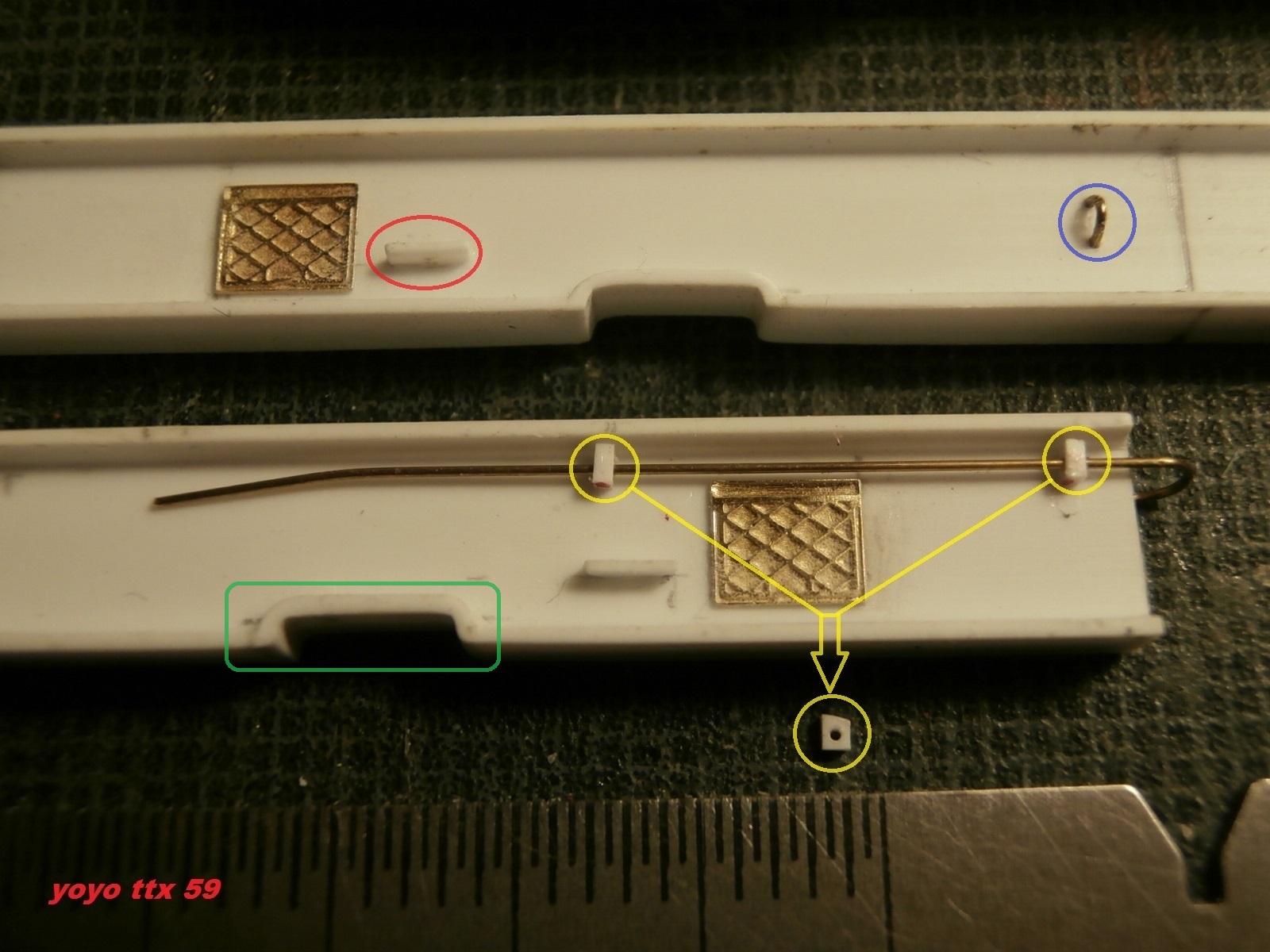 Voici quelques nouvelles sur l'avancé des travaux ( en date du 27/01/14 ).En vert:Rattrapage du longeron avec du evg 126 (0,5x3,2).Pliage a froid , collage , enduit et ponçage .En bleu:Anneau de passage de tuyaux hydraulique en fil laiton de D 0,3 .En rouge:Tôle de protection de boitier interrupteurs en evg 101 (0,25x0,75 L 2,5).En jaune:Supports de tuyau hydraulique (8 pièces) en evg 121 (0,5x0,75).Grande L=1,2 / petite L=1 / l=0,75 / Ep=0,5 / Trou de 0,3 (pièces en cours de finitions , elles ne sont pas encore collées