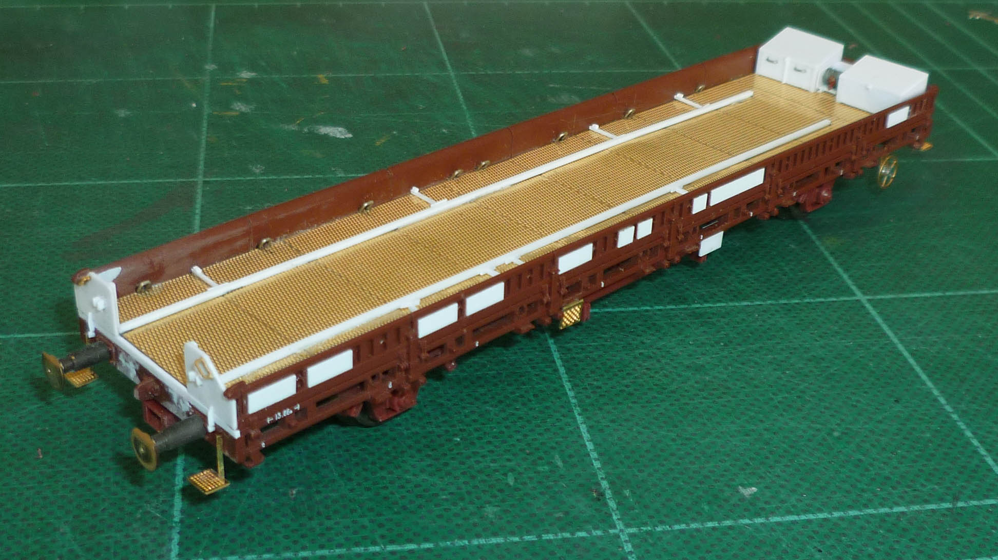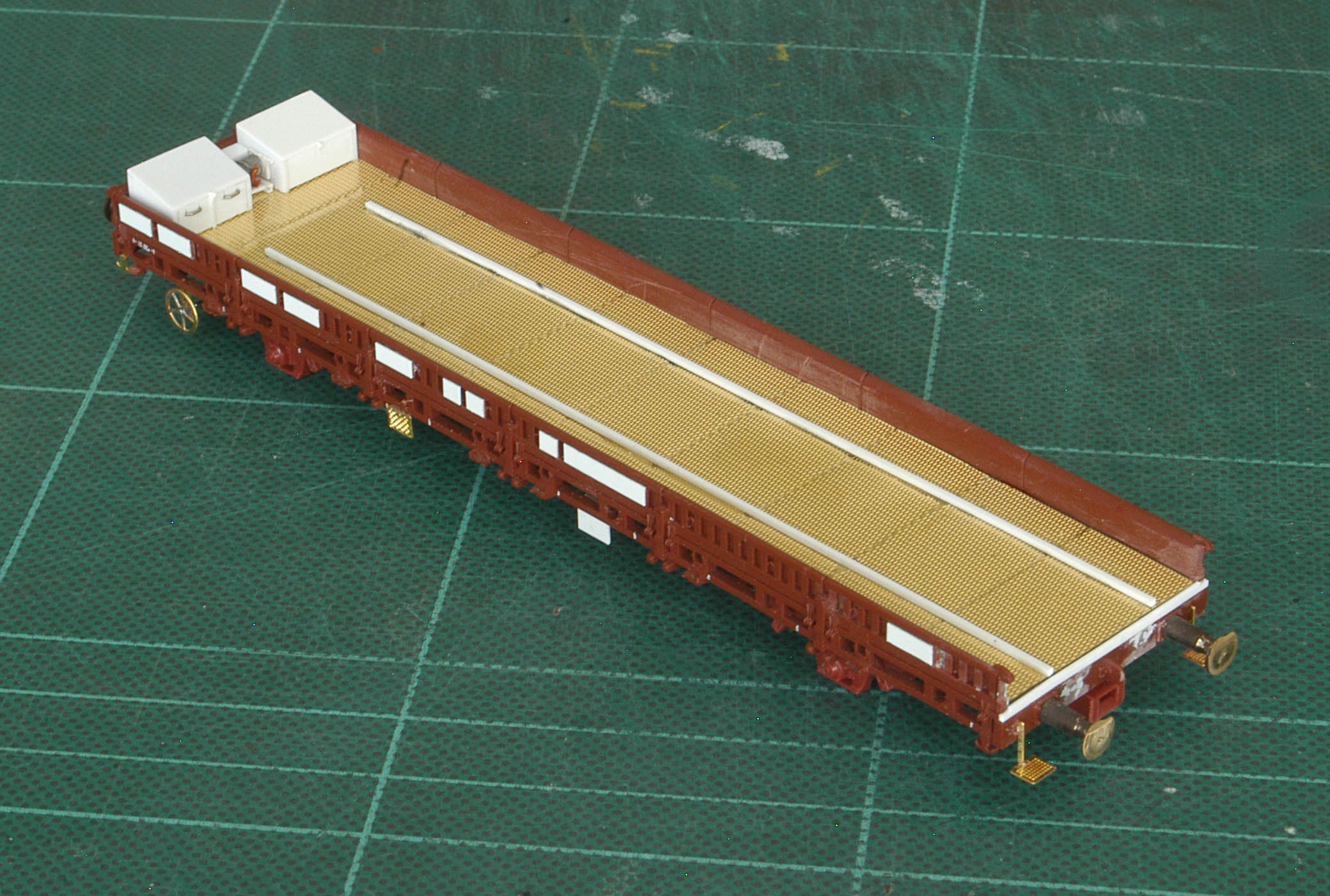 Poncer le dessus des tampons côté ridelle supprimée, puis réaliser les nouvelles ridelles en carte plastique. Ces ridelles se rabattent (en réalité seulement :roll: ) sur les tampons et sont raccordées à une rampe démontable qui permet de monter ou descendre la caleuse sans pour autant avoir besoin d'une quelconque grue.