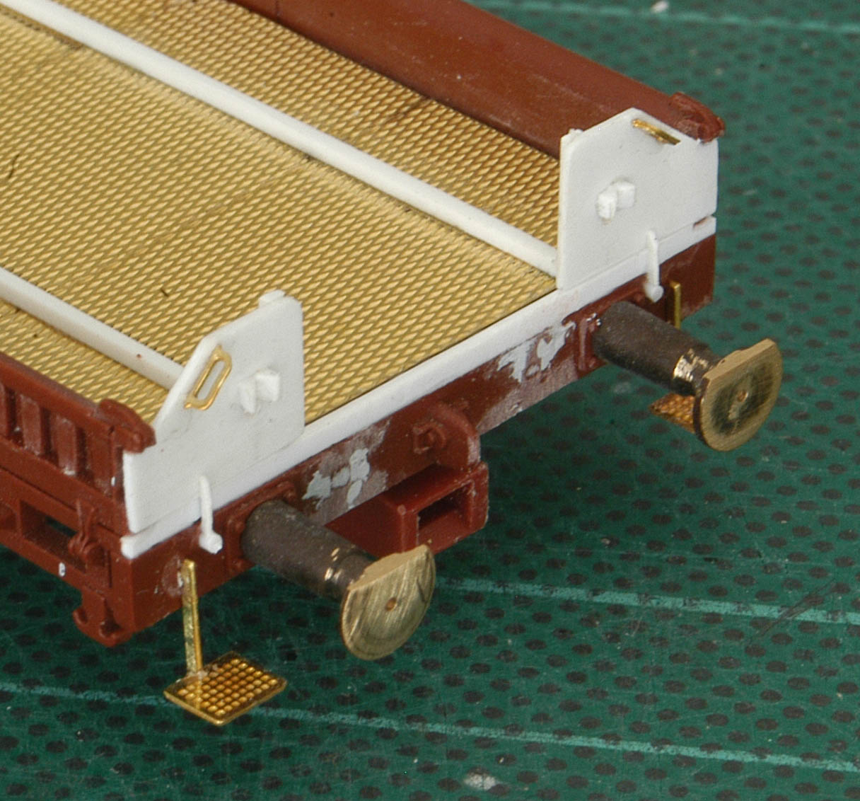 Les ridelles rabattables d'extrémité ont été équipées de mains montoirs SMD. Elles ont ensuite été collées en place, ont récupéré charnières et dispositifs de blocage, ainsi qu'un petit profilé sur leur face intérieure qui prolonge le rail une fois ces ridelles rabattues (en réalité, bien entendu :roll: ). Le masticage est nécessaire car la suppression de certaines pièces Roco d'origine a laissé place à quelques trous :?
