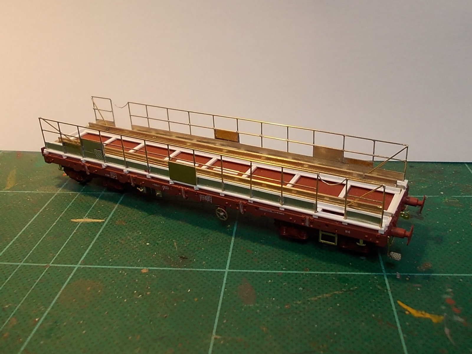 Voici une rame de wagons indissociables à tarer les bascules en cours de construction ,il en existe plusieurs,celle reproduite sera celle du dépôt de Longueau.La construction est intégrale sauf le Remms Oskar.Reste la mise en peinture et la pose de caillebotis Décapod ainsi que les fûts de charge.