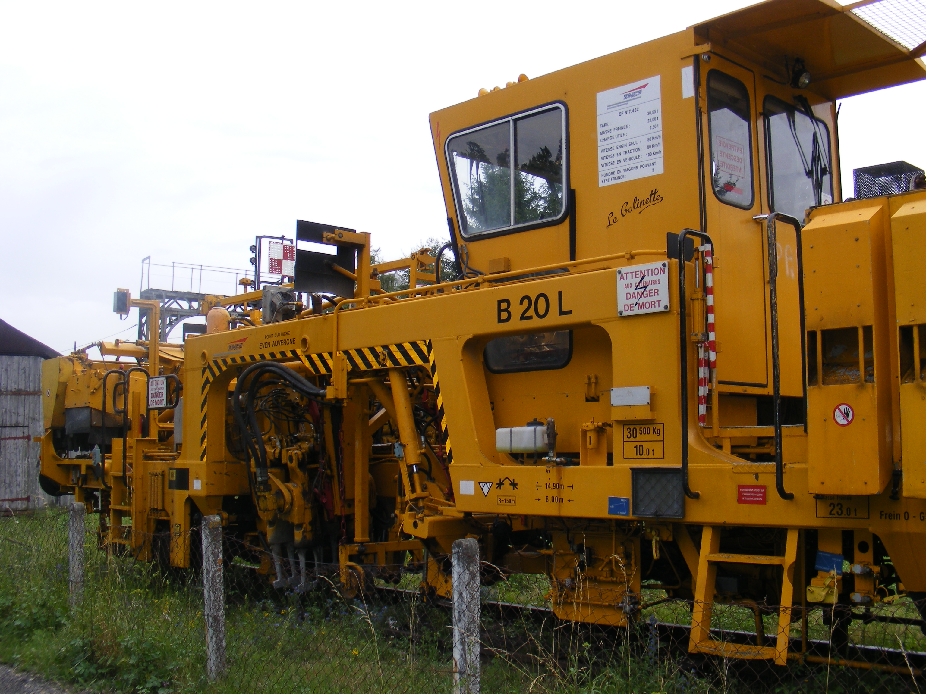 Photographiée en vitesse entre deux trains, voici la Bourreuse B 20 L de l'EVEN Auvergne surnommée "La Galinette" stationnée voie 2 en gare de Neussargues (Cantal).
