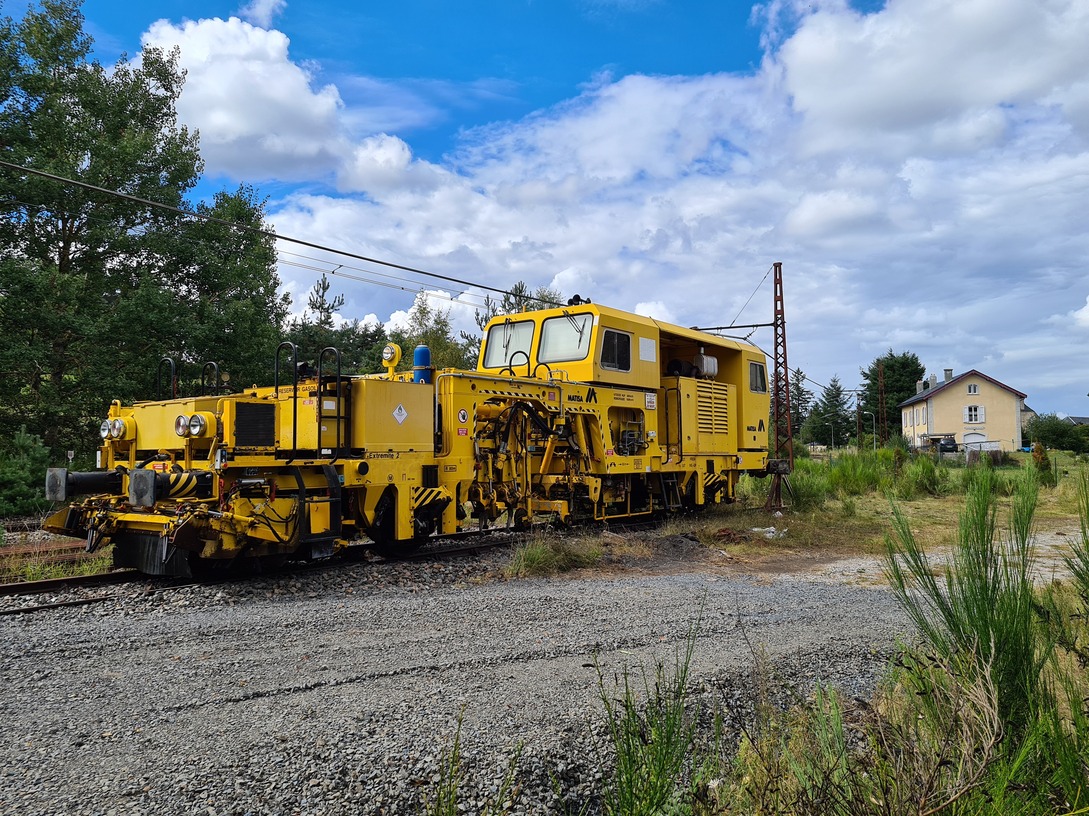 La voici stationnée en gare de Loubaresse dans le cadre des travaux de RT massif à l'été 2021 entre Loubaresse et Andelat (ligne 720000 Béziers - Neussargue)