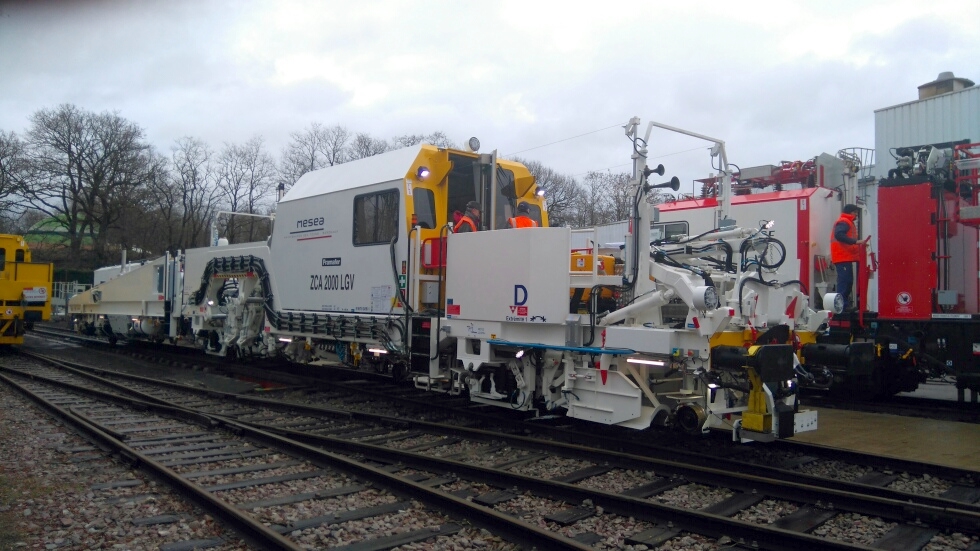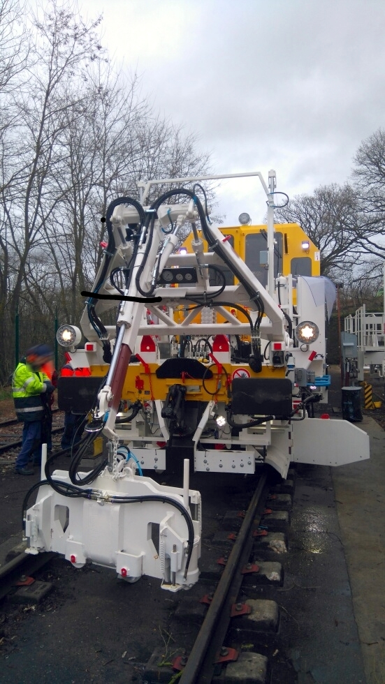 Voici les premières photos de la deuxième ZCA de MESEA. Cette machine est équipée de la presse STRAIT de redressage de rail faussé.