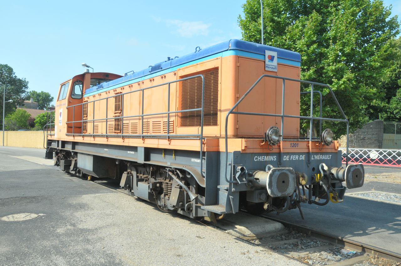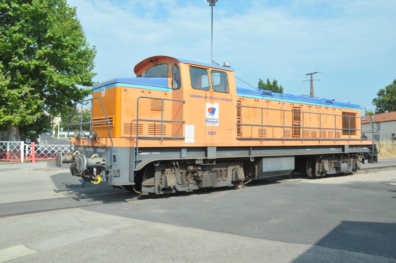 La 1201 aux nouvelles couleurs des Chemins de fer de l'Hérault stationne à Cazouls-les-Béziers précédant un wagon citerne de désherbage puis des wagons bois et un locotracteur lui aussi aux couleurs de ce département.