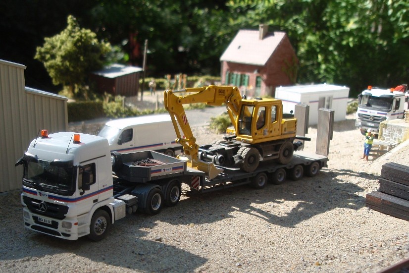 Une brosse à dent, un mélange terre broyée/sable hyper fin... c'est le mélange qui est collé sur le substrat, mais j'en saupoudre toujours un peu plus pour donner cette sensation « malléabilité » du terrain et afin de pouvoir laisser des traces de roues, des coups de godet, etc. En fait, c'est surtout la poussière résultant de ce mélange que j'utilise. Ensuite, tu projettes vers le véhicule, en visant les chassis, les pneus, bref la partie inférieure du véhicule. Pas de fixatif en ce qui me concerne. Toujours un pinceau à poils fins pas loin, pour nettoyer certains zones sur lesquelles les projections ne sont pas nécessaires.... Et voila, quand j'en ai marre, une petite rincette rapide du camion et on repart à zéro.