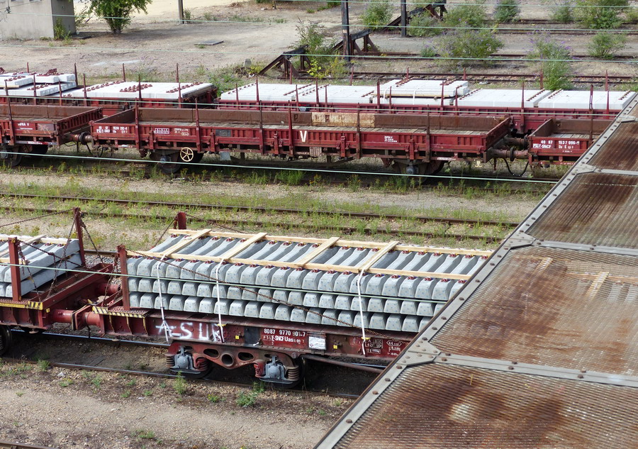 Voici le wagon 80 87 977 0 901-7 Uas R09 7 F SNCF-PSL Ã Saint Pierre des Corps le 16-09-2014 vide de chargement de traverses