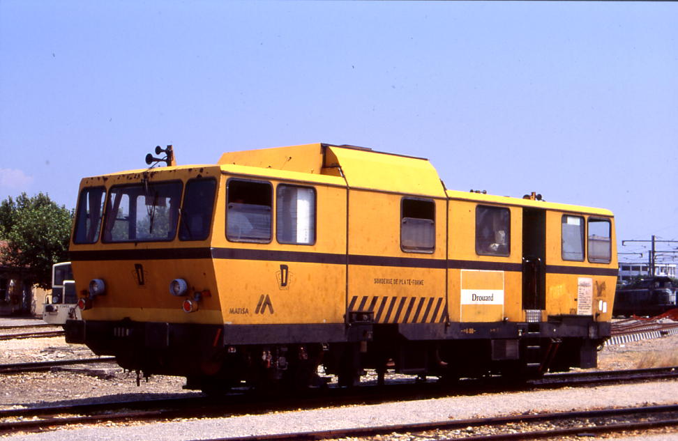 Il s'agit comme tu l'indiques d'une plateforme sondeuse chargée de ... sonder la plateforme de voie par carottage. Cet engin, de type VM 200 C, a été construit par Drouard en 1988. Matisa a ensuite racheté le brevet. Elle a été modifiée en août 1995 avec l'ajout d'un plat K50 sur lequel se trouve un groupe électrogène ainsi qu'une ancienne cabine de bourreuse 08 32 C comportant un des deux postes de conduite, l'autre se trouvant sur la plateforme sondeuse.