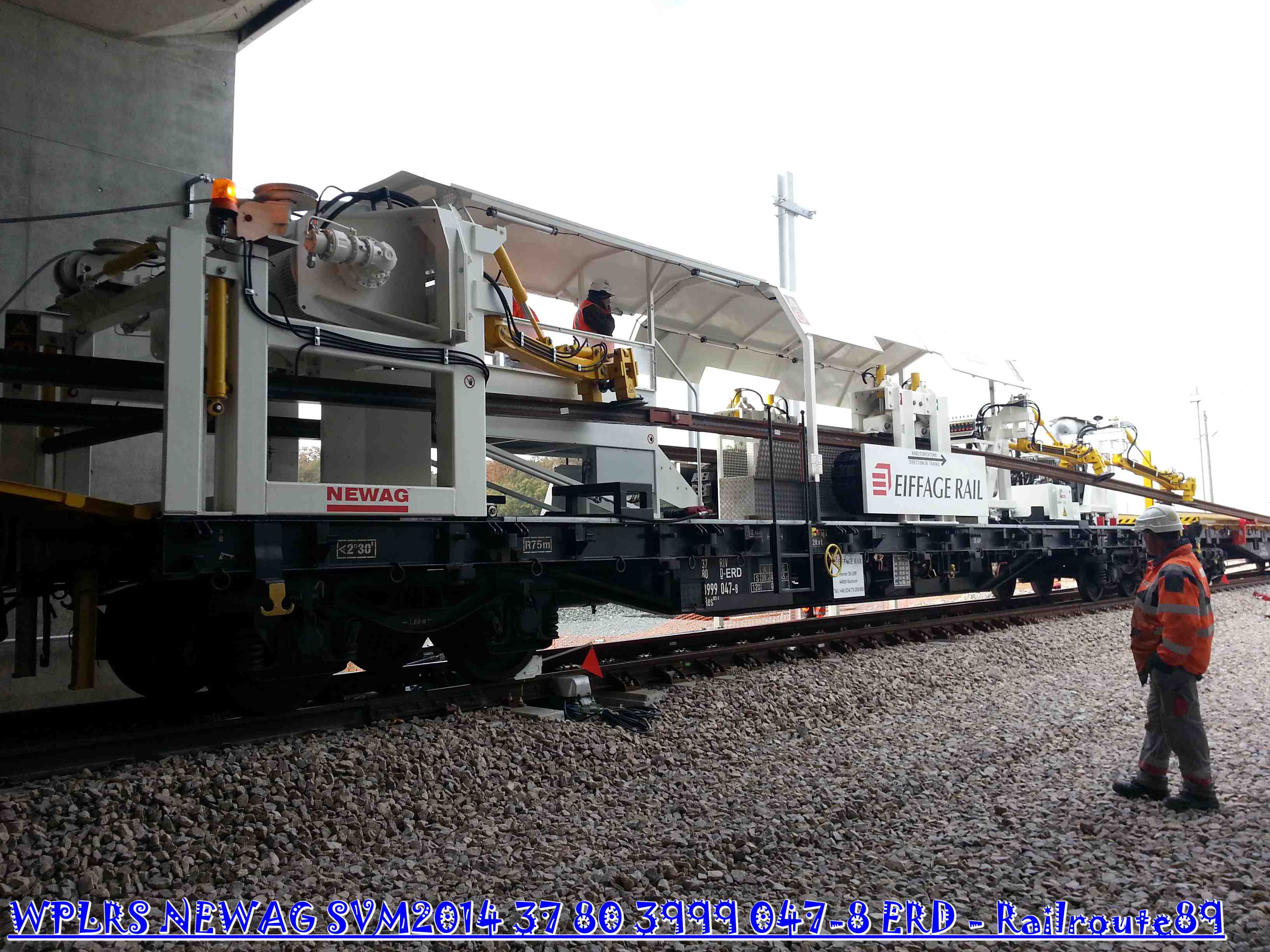 , ce Wagon Pousseur de LRS appartenant à ERD et couplé au SMD80 normalement.Les photos ont été prisent à la BTx de Sablé où l'on s'en est servi pour la dépose des LRS sur la partie alignement devant la BTx... Les barres (108m) étaient donc accrochées à l'aide des élingues sur les wagons de transport et tirées, poussées par le NEWAG à l'aide du système de chenilles, ensuite de part et d'autres à l'aide de la Mecalac 8MCR n°01218 équipée d'une pince à rails à galets, je guidais et posais les LRS sur les rouleaux situés sur les côtés des wagons. En sortie de ces derniers, les barres étaient soulagées par la 8MCR et L'Unac W074 ER, une autre 8MCR équipée d'une potence avançait en soulageant et guidant les LRS afin de les poser sur les rouleaux se trouvant sur la sous-couche... Un D6 s'occupait de tirer les barres déposées sur l'alignement.Ferroviairement...