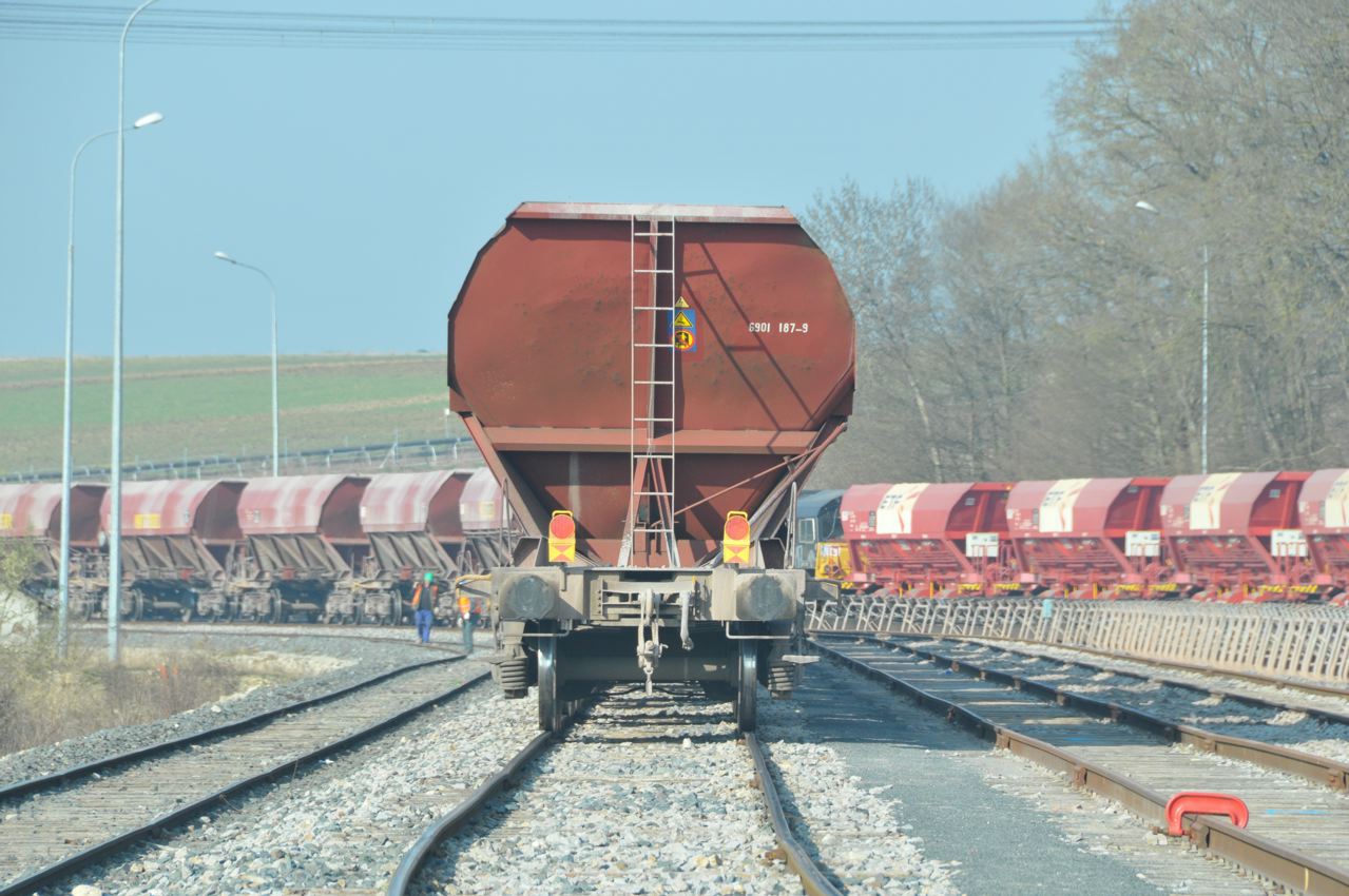 Au centre-gauche une rame des Faps (EX) qui font la navette entre carrieres et platforme-ballast, arrière-plan droite les Fanps (avec déversoirs) pour le transport final, et entre les deux le système avec des tapis-roulants pour transporter le ballast arrivant dans les Faps, soit au dépôt, soit vers le transbordeur pour le charger directement dans les Fanps (comme est le cas ici).