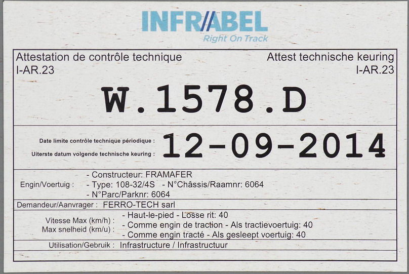 et attestation de contrôle technique : INFR//ABEL W-1578 D 12-09-2014 pour (B) et (CFL)