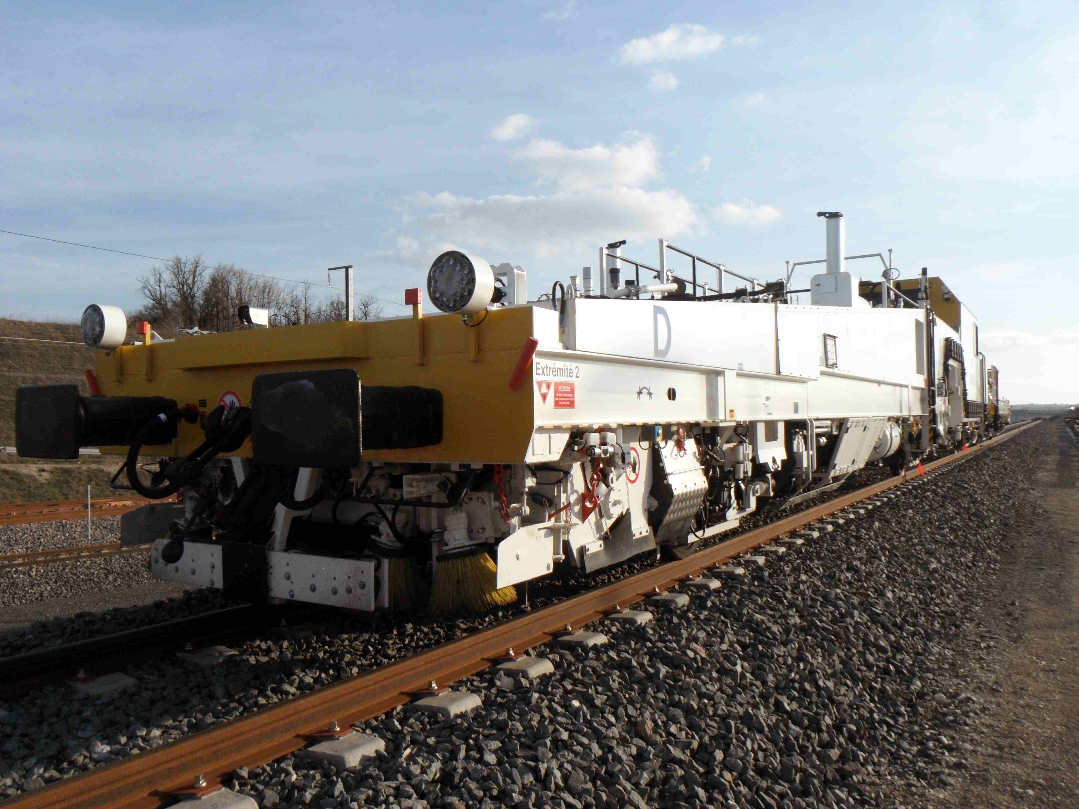 Voici les premières photos prises en décembre du côté de Béning de la première bourreuse ZCA 2000 LGV de MESEA. C'est en fait un petit couple ZCA 2000 LGV 99 87 9 124 555-3 et wagon stabilisateur VGS04 99 87 9 326 503-9 . Les machines ont encore une livrée blanche incomplète, il manque les logos MESEA. Ces machines sont en cours d'agrément de circulation et de travail.