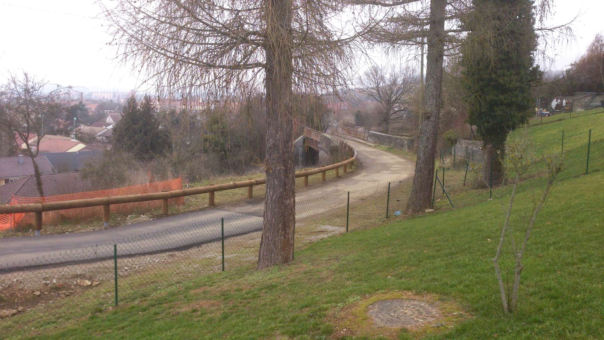Je suis passé début janvier rue du Coteau à Danjoutin, sur le pont du Stratégique situé après le PN2 en direction de Delle. La liaison entre l'allée des Pommiers et la rue du Coteau a bien été réalisée à la place du passage auparavant réservé aux piétons. Une petite partie de la propriété à gauche a été réduite, et la rue du Coteau a été surélevée pour rattraper la pente. Une glissière de sécurité métallique avec un habillage bois a été installée pour éviter que des véhicules qui loupent le virage descendent le talus vers la voie.