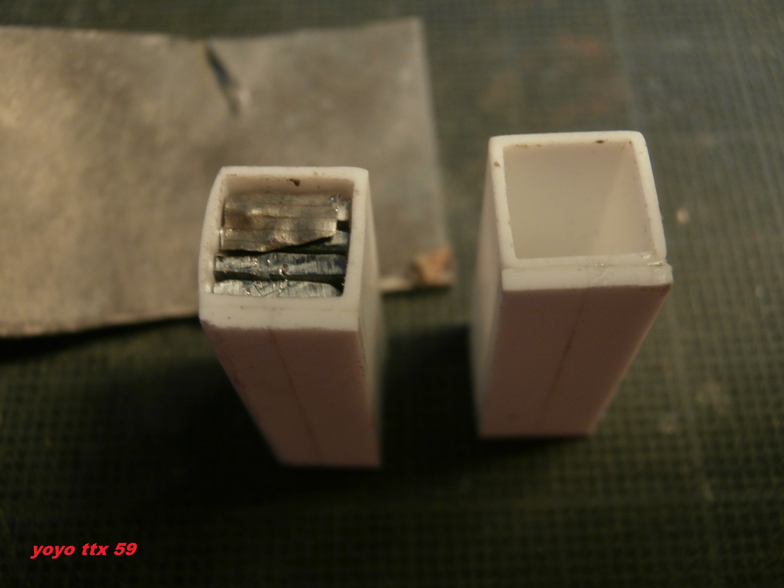Voici deux exemples avec les réservoirs de carburant et le réservoir de groupe hydraulique de mon COMBI 20 :Lestage des réservoirs carburant :Lestage du réservoir de groupe hydraulique :Le tout refermé avant la mise en forme et pose des détails :Et voila